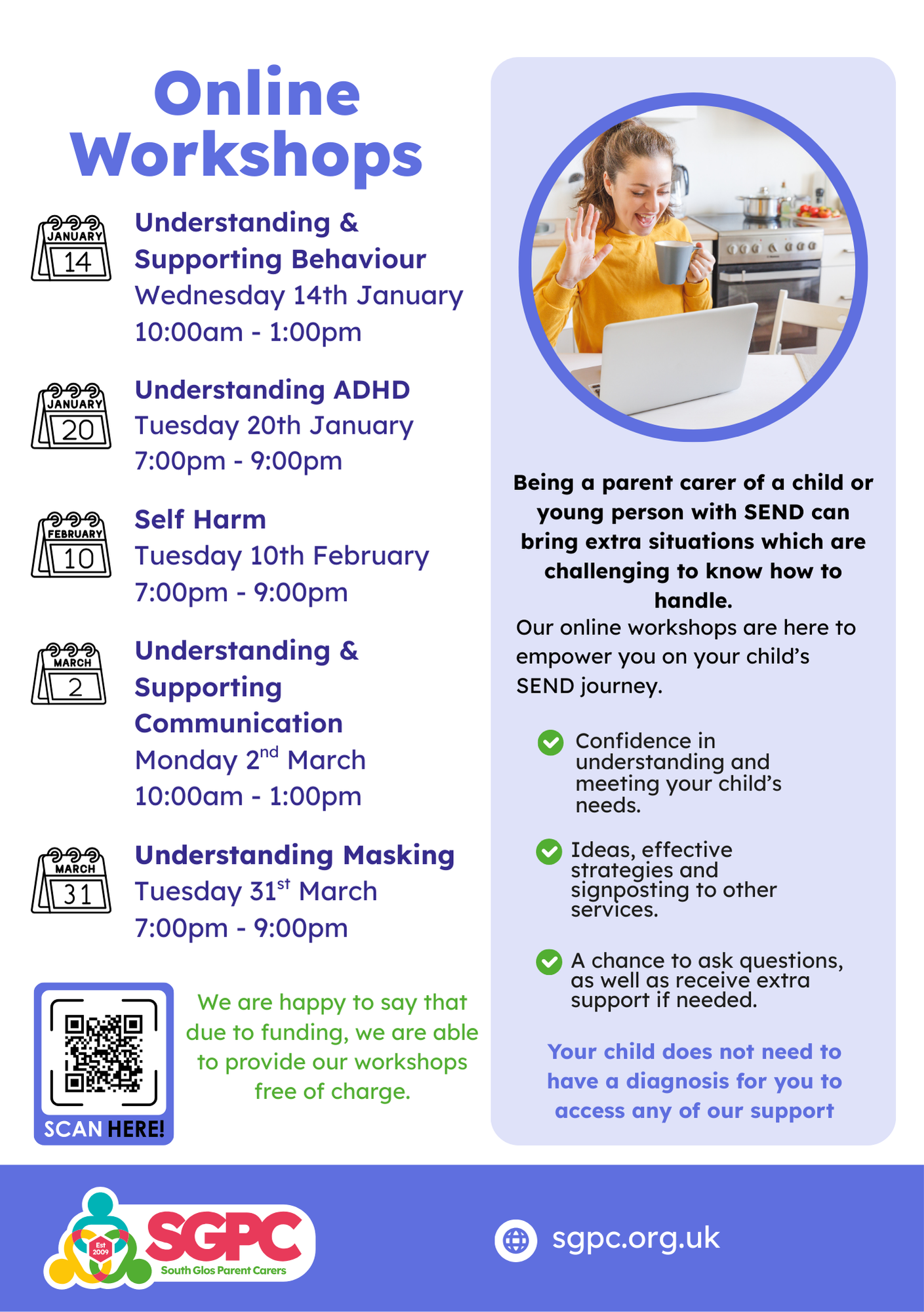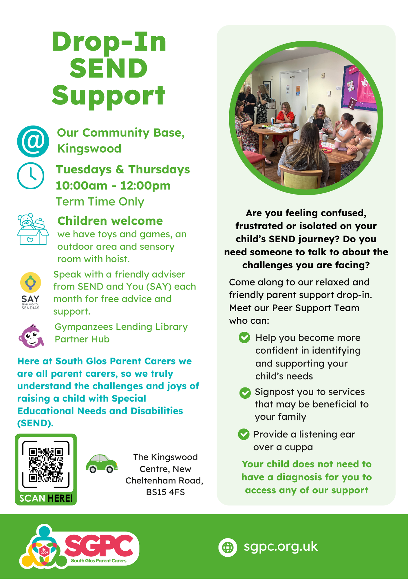 SGPC support: Here at South Glos Parent Carers (SGPC) we are all parent carers ourselves and understand the challenges you face. We have a range of support available. please note, this will re-open after the Christmas break on Tuesday 6 January.